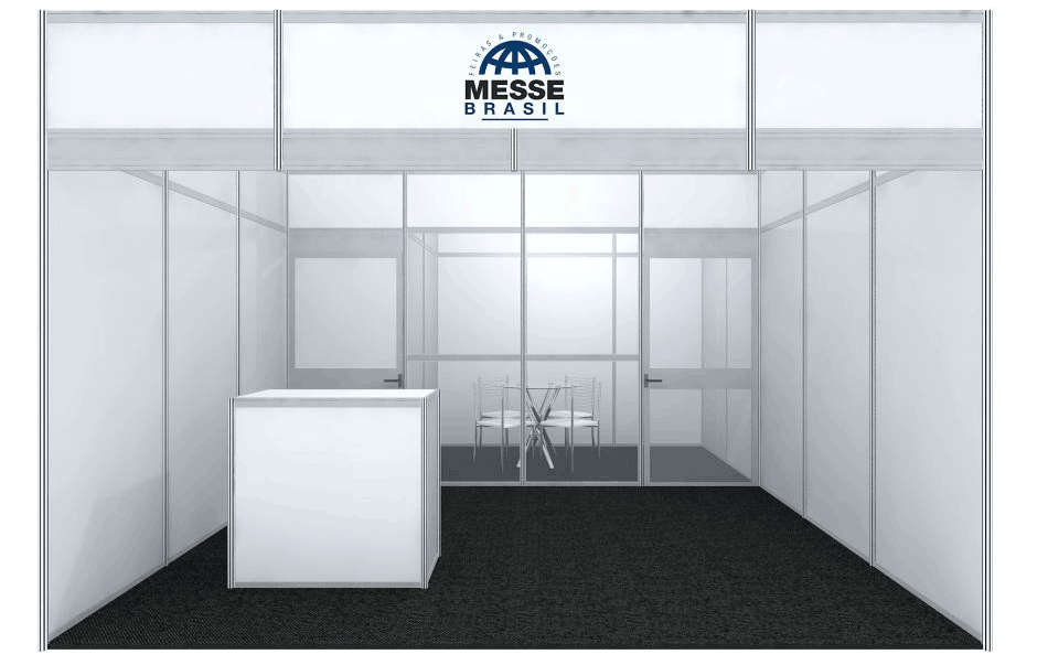 Paredes e testeiras com painéis brancos em TS e vidros de cristal, altura de 2,70 metros.