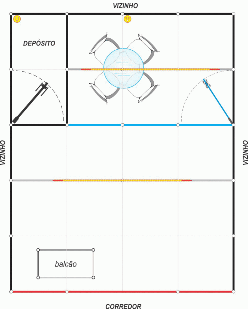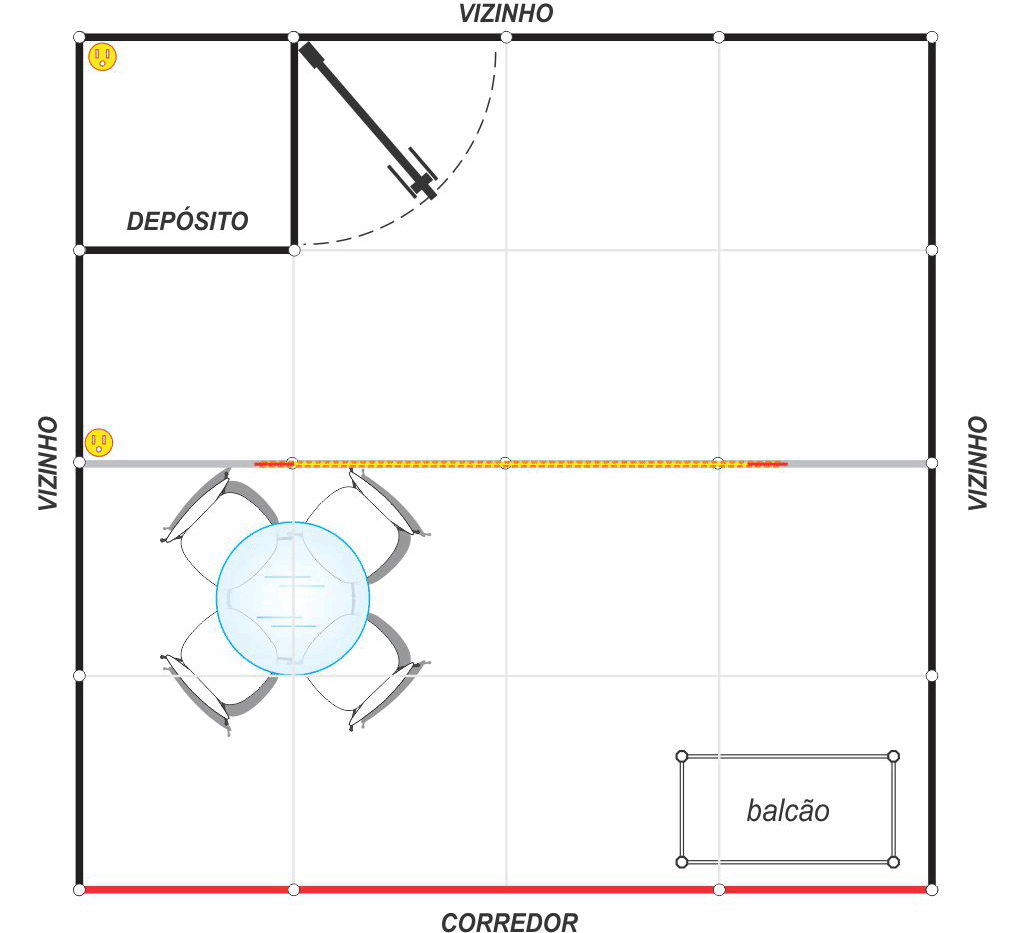 1 balcão vitrine 1,00 x 0,50 x 1,00m, 1 mesa com tampo de vidro redondo, 4 cadeiras.